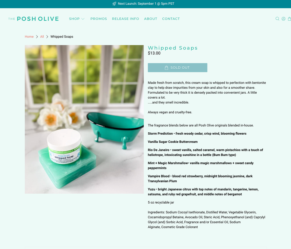 Margaret runs her business on a release schedule- she makes batches of products in a variety of scents, lists them for sale on her site, and she literally SELLS OUT of everything. Rinse and repeat, about every month.